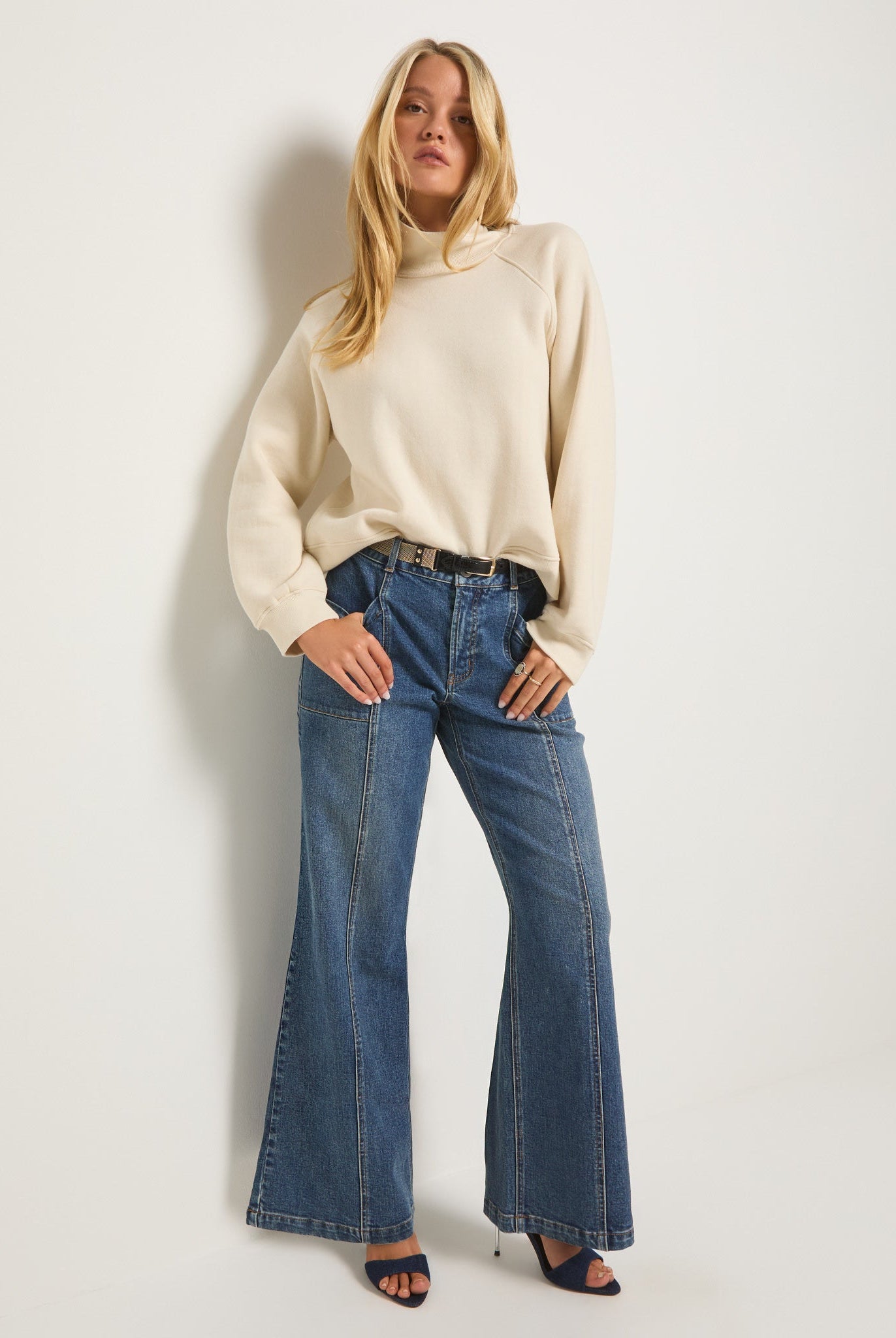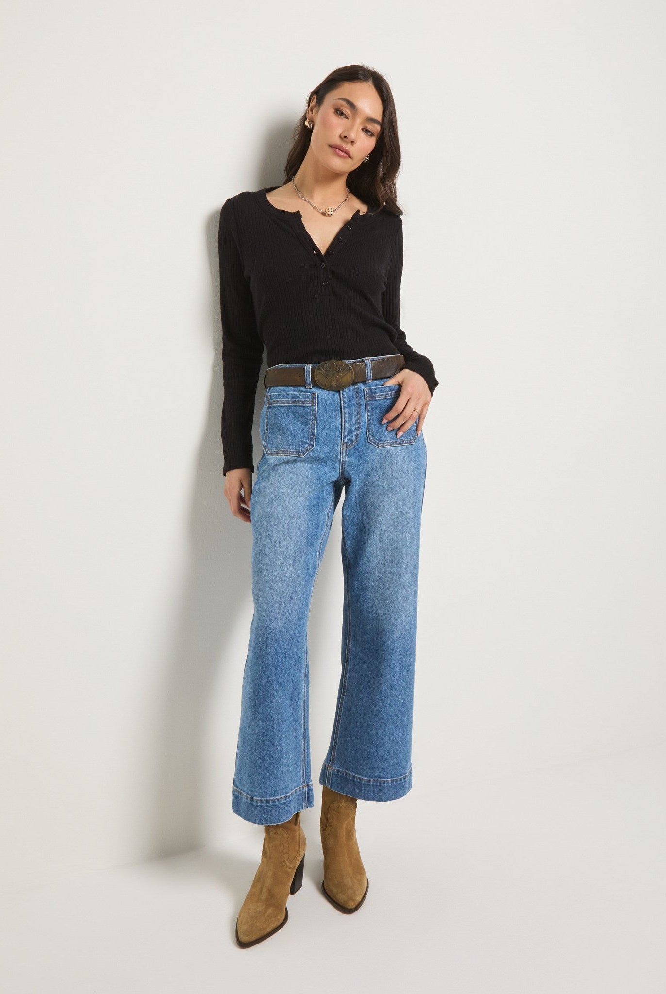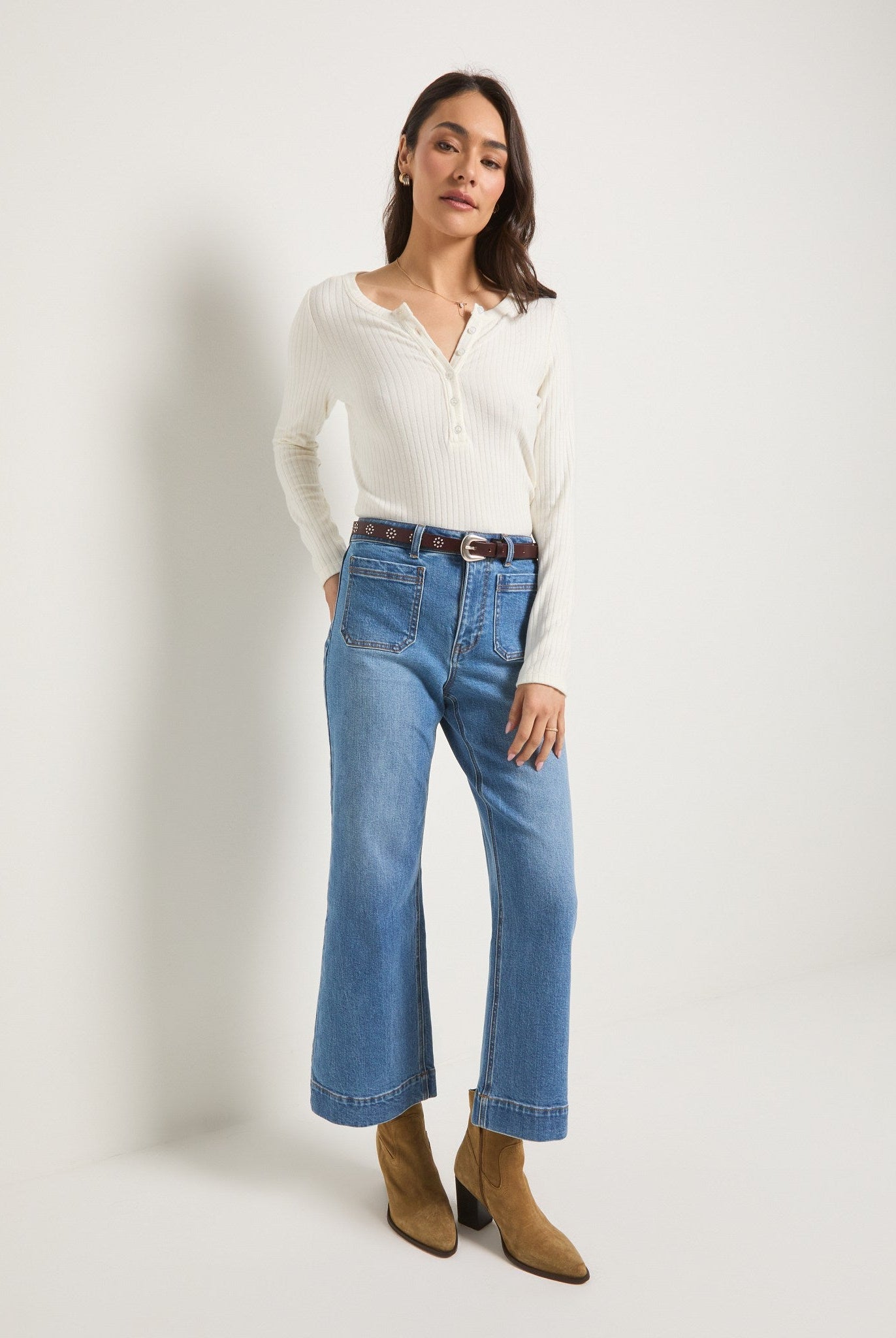 A streamlined silhouette with vintage-inspired details like patch pockets and a center seam. These jeans are built to elevate every tee or tank in your wardrobe. Mid-rise flares give that long-leg illusion, while still playing nice with boots or sneakers.