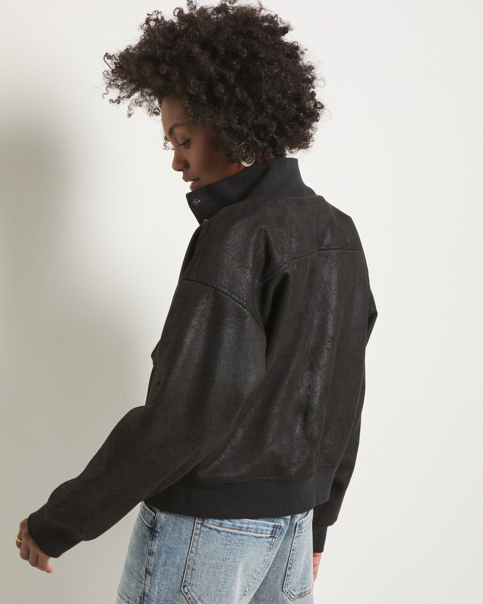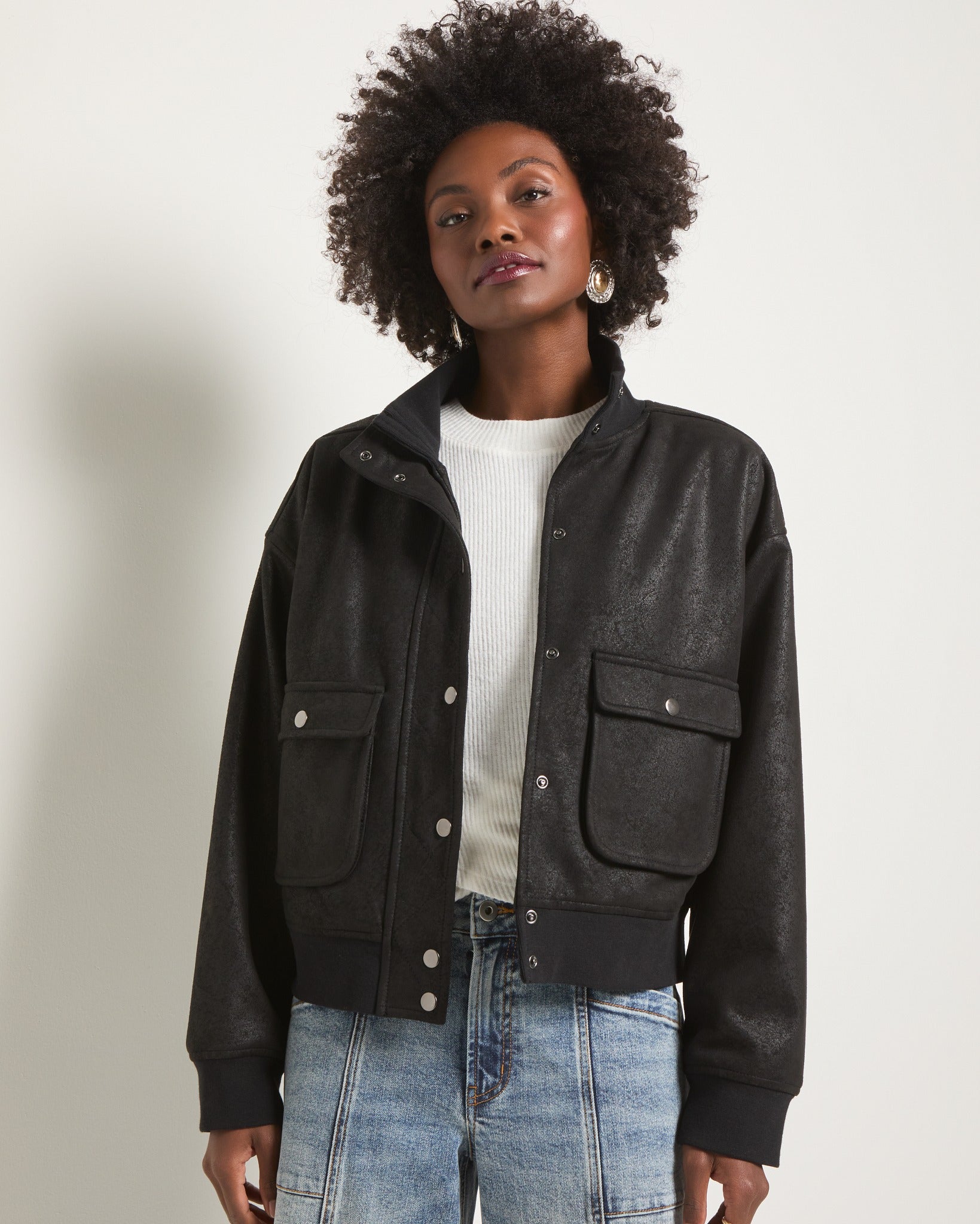 With a soft faux suede finish, knit trim, and snap-up details, this bomber was made for leaving town—or just looking like you might. Pairs best with denim and a disappearing act.