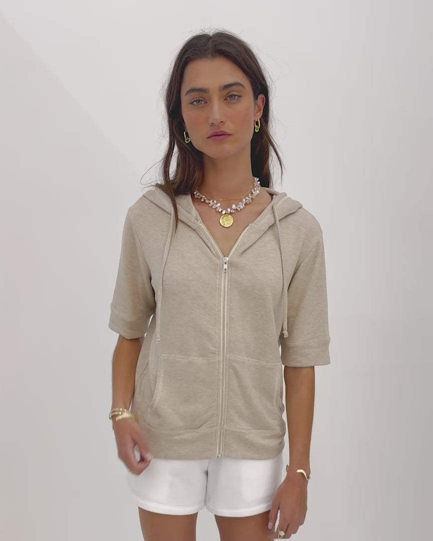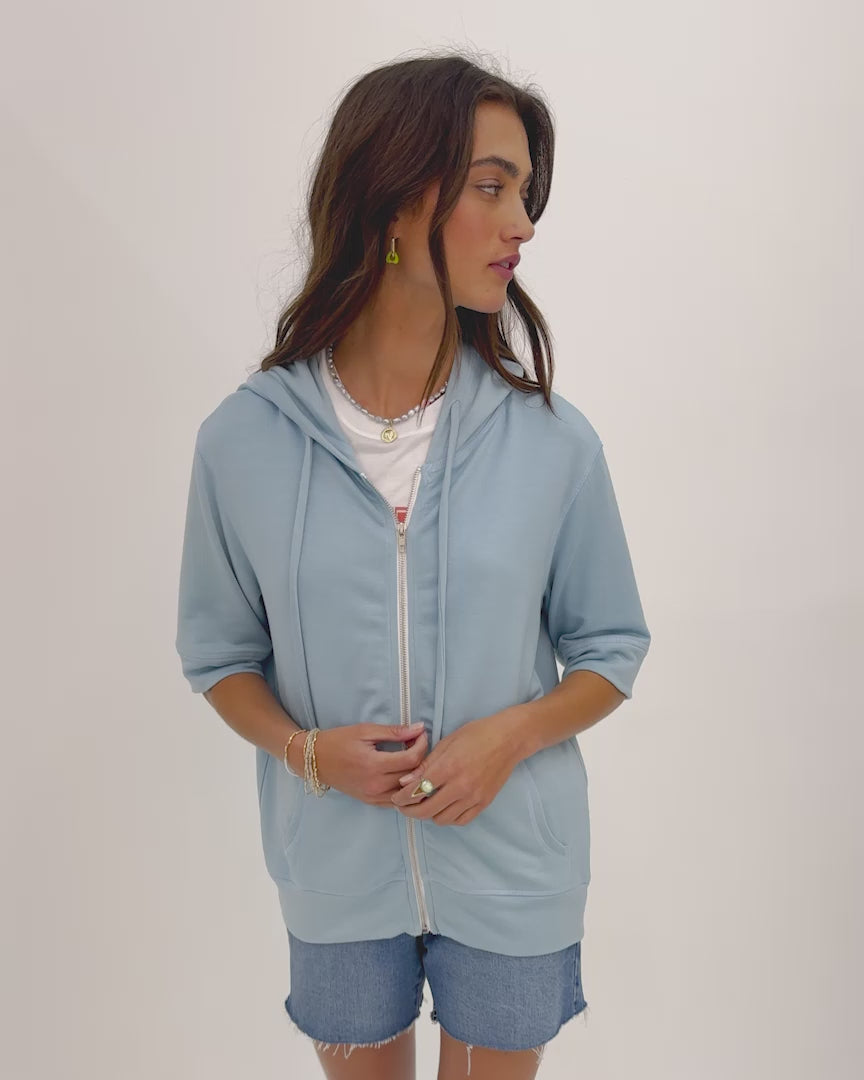The perfect in-between layer. This short-sleeve zip-up hoodie brings the best of both worlds—easy, lightweight, and just the right amount of cozy. With elbow-length sleeves, a split kangaroo pocket, and a drawstring hood, it’s the throw-on-and-go piece you didn’t know you needed.