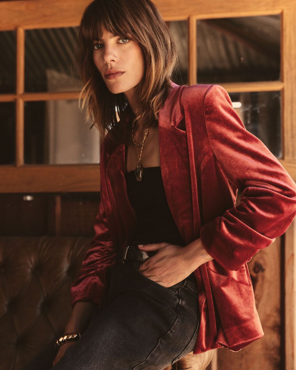Proof that power dressing doesn’t have to be stiff. This velvet blazer walks the line between polish and ease. The open front gives it a chill, throw-it-on vibe, while the 3/4 length ruched sleeves say, “Yeah, I planned this.” Perfect for drinks downtown, gallery openings, or just elevating a tank and jeans.