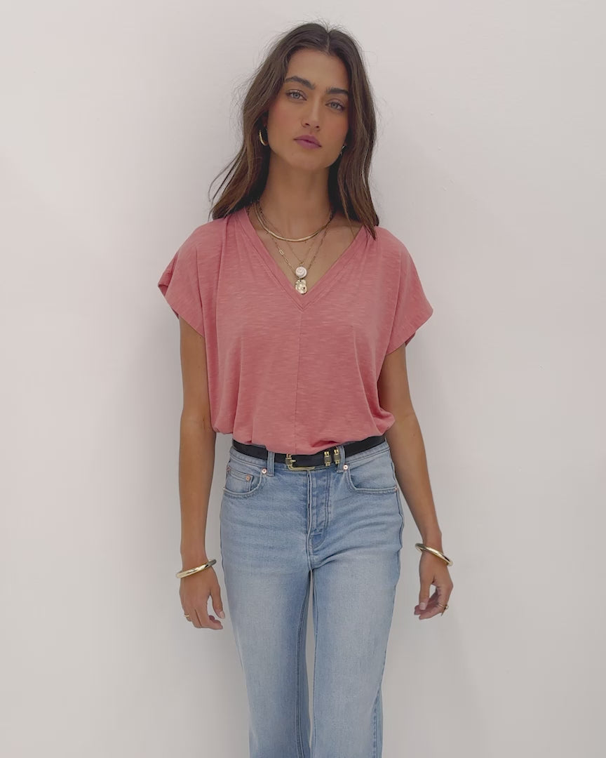 This isn’t your average V-neck—it’s the upgrade your wardrobe’s been waiting for. With a relaxed fit, short dolman sleeves, and a sleek center seam, it’s understated but never boring. Made in the USA from a soft, breathable slub knit, it’s the tee you’ll keep coming back to.